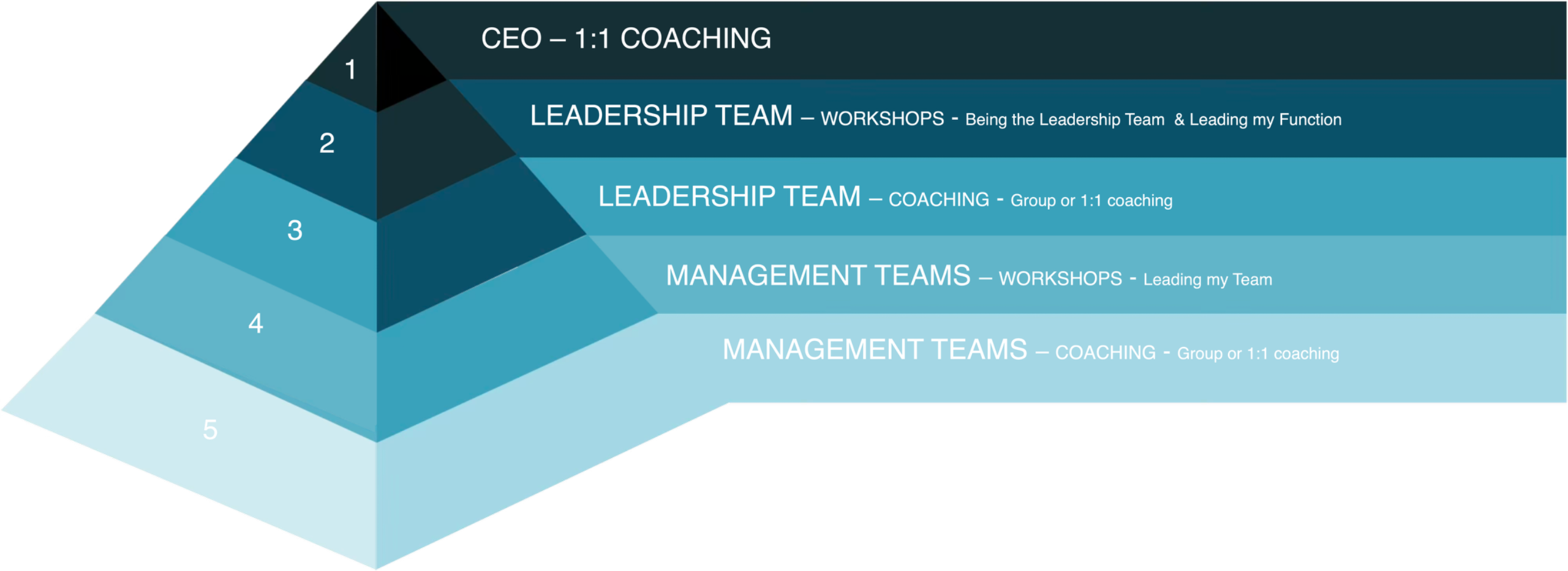 Every engagement starts with the CEO. From there, the work can extend into the organisation at whatever depth the situation requires; sometimes CEO 1:1 is all that is needed, and sometimes more is called for. The CEO work can also dovetail with the implementation of internal leadership development you do in-house.